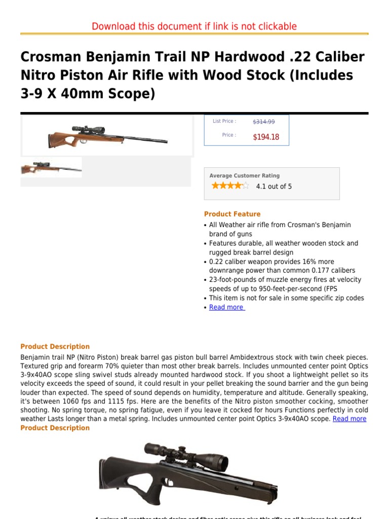Crossman benjamin trail np2 hardwood gas piston air rifle 5 5mm r 6 699 00 benjamin trail break barrel air rifles are the first to feature the all new nitro piston elite system featuring an upgraded powerplant and all new enhanced clean break trigger cbt.
